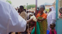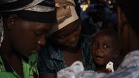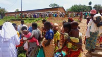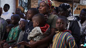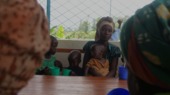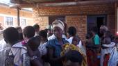 Auf dem großen Anwesen mit mehreren Gebäuden aus roten Lehmziegeln sitzen bereits rund 80 Frauen in bunten Wickelkleidern mit ihren Kindern im Schatten einer blauen Plastikplane.