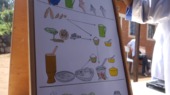 Die Schautafel zeigt, wie mit knappen Lebensmitteln nahrhafte Speisen zubereitet und Kinder ausgewogen ernährt werden können.