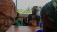 Dicht gedrängt sitzen die Mütter an langen Tischen unter dem Wellblechdach der Baracke. Die Schwestern verteilen Löffel, damit die Frauen auch die letzten Breireste aus den Bechern kratzen und ihre Kinder besser füttern können. Für die meisten hier ist es die erste Mahlzeit des Tages.