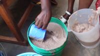 In einer der Baracken schöpft eine Ordensschwester frisch gekochten Brei aus Sorghum, Soja, Mais und Zucker in Plastikbecher, die an die wartenden Mütter ausgegeben werden.